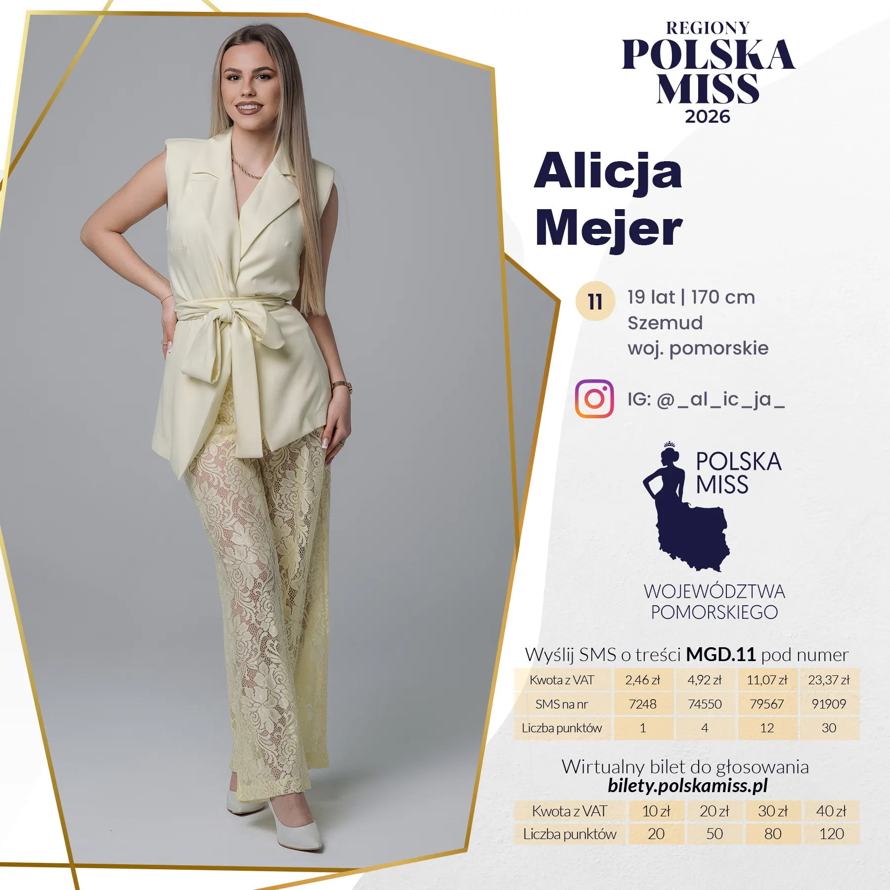 Alicja Mejer, 19-letnia mieszkanka Szemuda o wzroście 170 cm. Jej naturalny wdzięk, pewność siebie oraz ambicja pozwoliły jej pokonać liczną konkurencję i oczarować jury. Zwycięstwo Alicji to nie tylko jej osobisty sukces, ale także wspaniała promocja dla samej Gminy Szemud, o której dzięki niej usłyszało całe województwo.