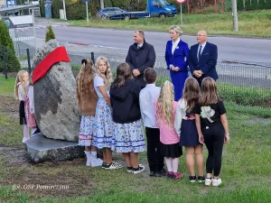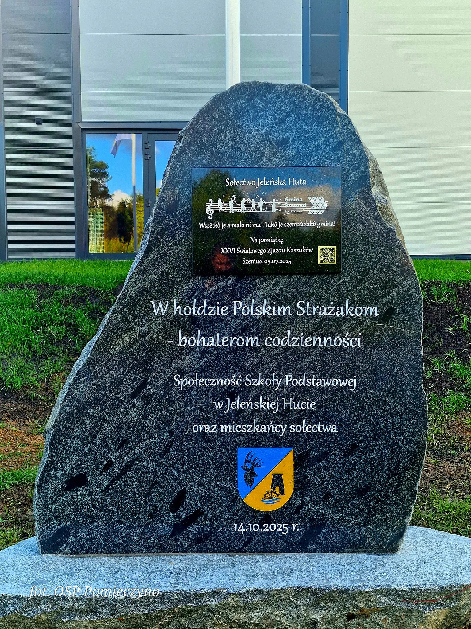 Jeszcze przed rozpoczęciem głównych uroczystości, dokonano oficjalnego odsłonięcia kamienia pamiątkowego. Ten symboliczny gest, będący efektem wspólnej pracy Sołtysa Kazimierza Potrykusa, szkoły i mieszkańców, oddaje cześć strażakom, a jednocześnie upamiętnia XXVI Światowy Zjazd Kaszubów w Szemudzie, łącząc lokalny patriotyzm z kaszubską tożsamością. Tablica jest wyposażona w kod QR, który przenosi skanujących do multimedialnej prezentacji „Szemudzkich Nut”.