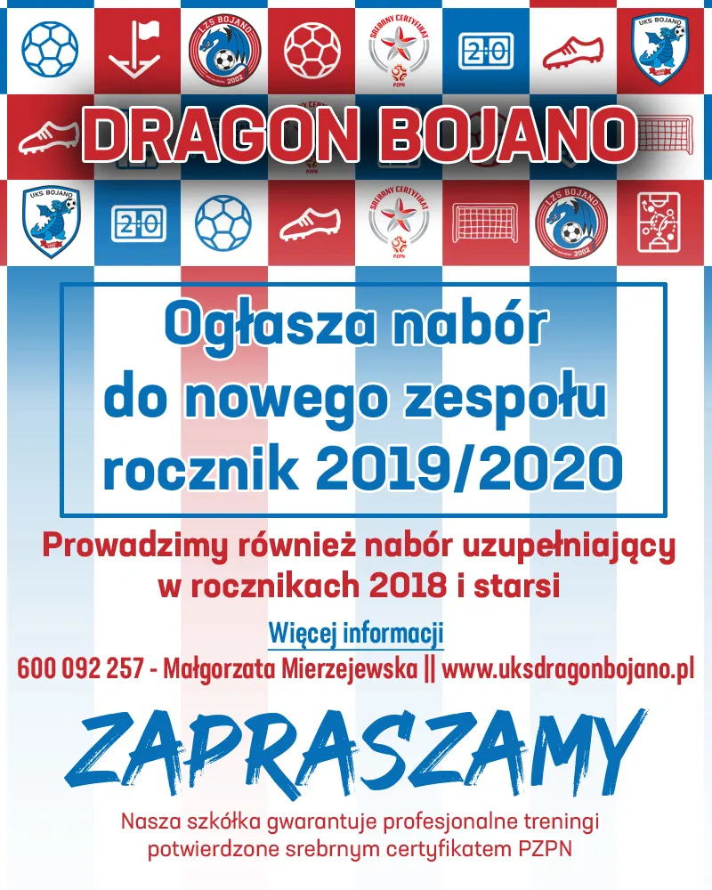 Dragon Bojano zaprasza na nabór do nowego zespołu Skrzaty G2 obejmującego roczniki 2019-2020. Treningi Skrzatów G2 będą prowadzone przez doświadczonego trenera Mateusza Cytryniaka, co daje młodym zawodnikom szansę na rozwój w profesjonalnym środowisku.