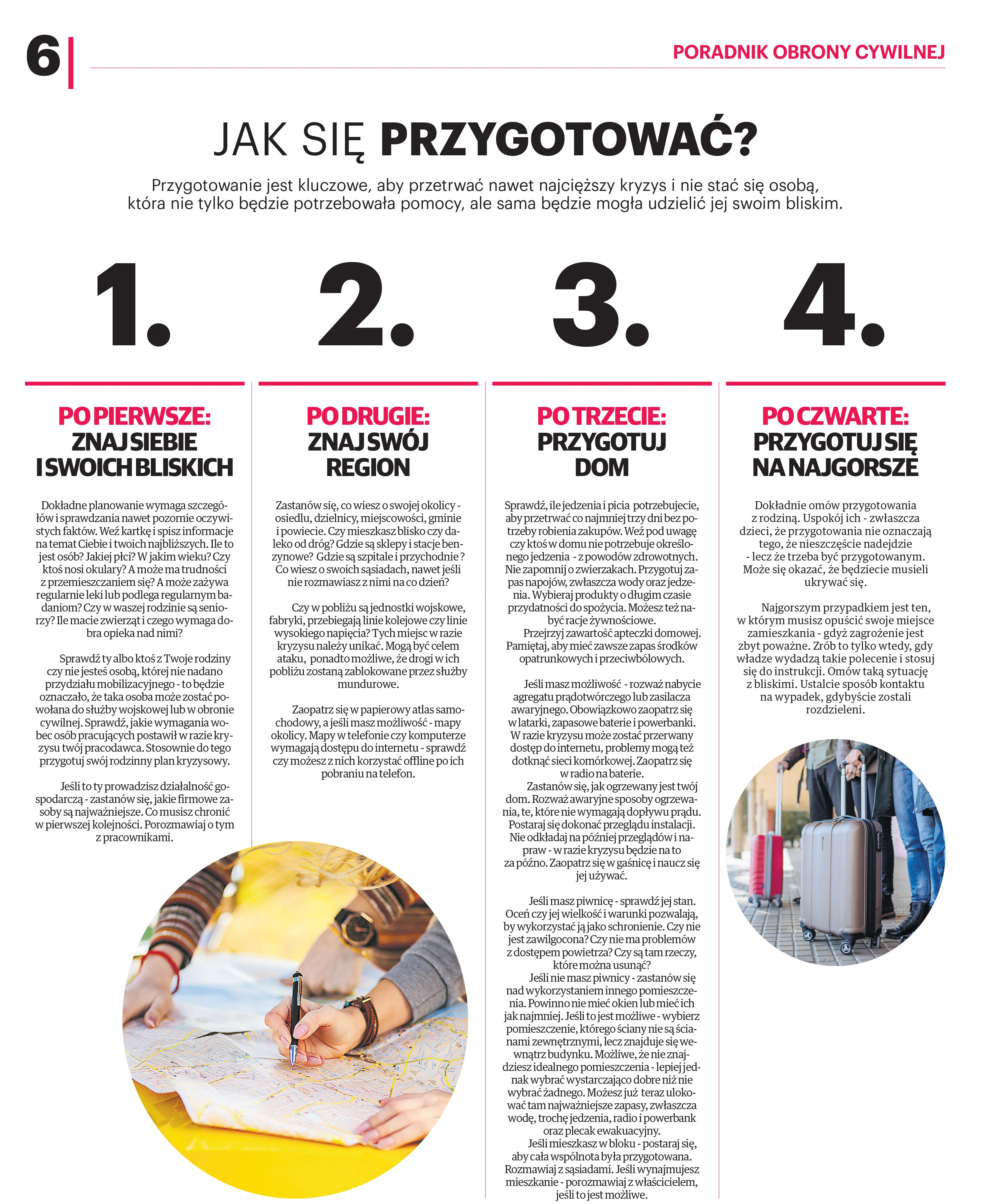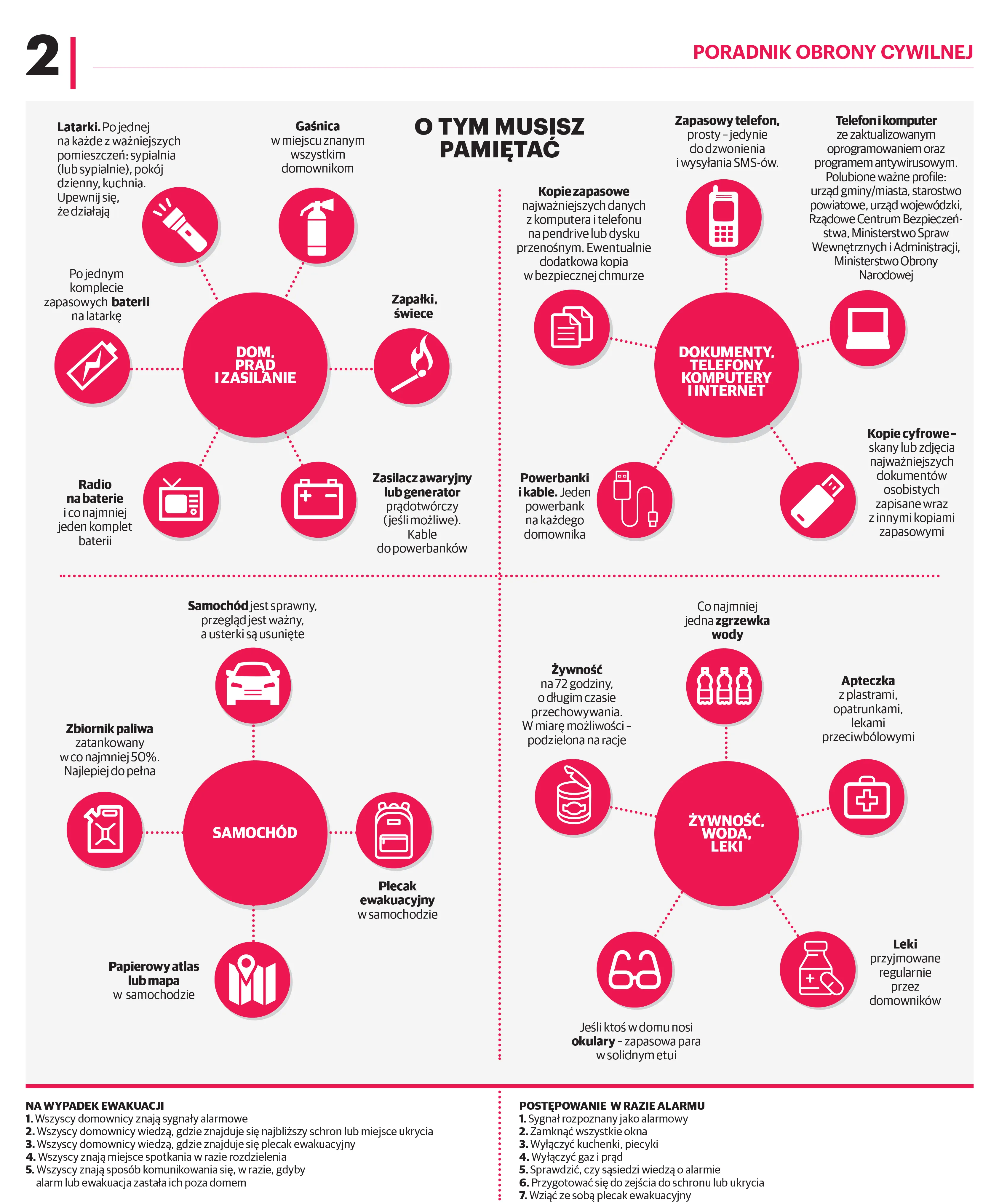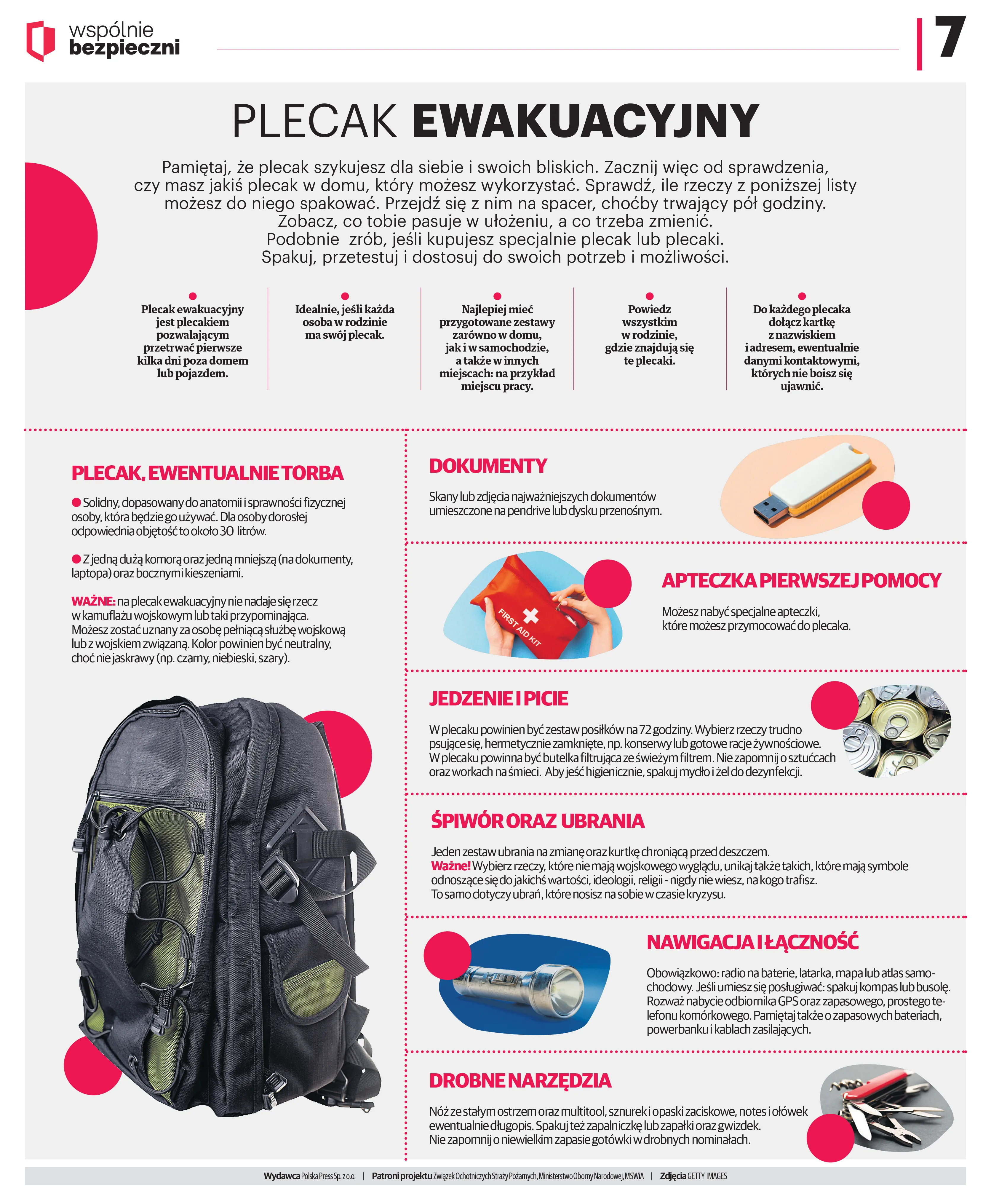 Więcej praktycznych wskazówek znajdziemy na stronie gov.pl w zakładce „Poradnik na czas kryzysu i wojny”. Jest to oficjalne kompendium wiedzy przygotowane przez MSWiA, MON oraz RCB. W serwisie tym można m.in. zagrać w grę, która w przystępny sposób uczy, jak prawidłowo skompletować plecak ewakuacyjny, oraz pobrać instrukcję skompletowania plecaka do druku. Oficjalny adres poradnika pod tym linkiem.