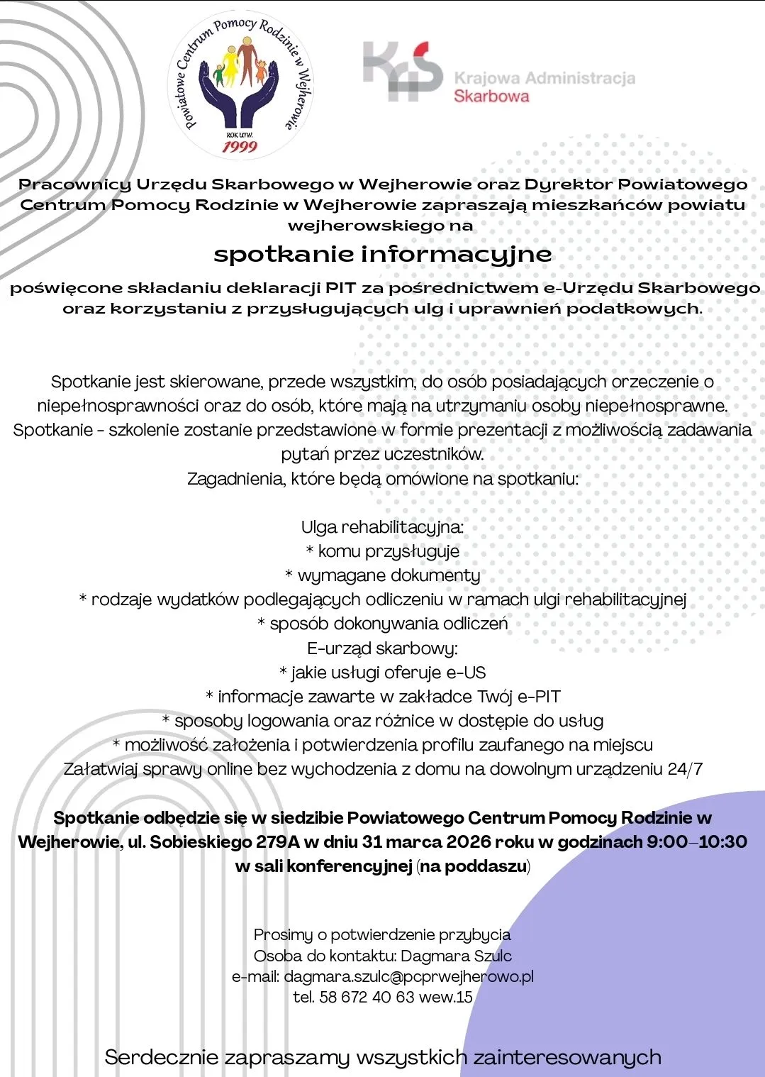 Czas rozliczeń podatkowych to dla wielu osób okres pytań i wątpliwości – szczególnie gdy w grę wchodzą ulgi związane z niepełnosprawnością. Aby ułatwić to zadanie, Powiatowe Centrum Pomocy Rodzinie w Wejherowie wraz z Urzędem Skarbowym organizują specjalne spotkanie informacyjne dla mieszkańców.