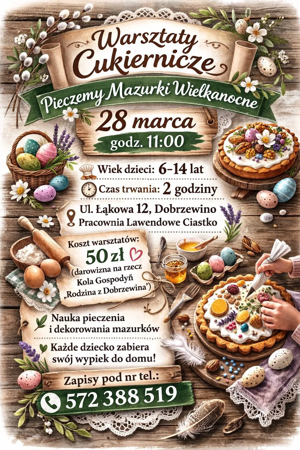Wielkanoc zbliża się wielkimi krokami, a wraz z nią zapach domowych wypieków. Koło Gospodyń Wiejskich „Rodzina z Dobrzewina” zaprasza na „Warsztaty Cukiernicze”, podczas których mali artyści przemienią się w prawdziwych mistrzów mazurka! Spotkanie odbędzie się w Pracowni „Lawendowe Ciastko”. To idealna okazja, by połączyć naukę pożytecznych umiejętności z wyśmienitą zabawą.