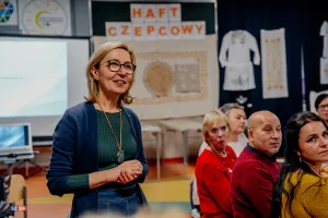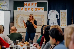 Goście mieli również okazję wysłuchać fascynujących prelekcji. Etnograf Benita Grzenkowicz-Ropela z Muzeum Piśmiennictwa i Muzyki Kaszubsko-Pomorskiej w Wejherowie przybliżyła historyczny kontekst i symbolikę kaszubskiego haftu, dzieląc się ciekawostkami i „prawdziwymi historiami” tego rzemiosła. Pani Benita podkreśliła również znaczenie haftu jako elementu budującego wspólnotę wśród kobiet oraz jego fundamentalną rolę w określaniu kaszubskiej etniczności – zaraz obok języka. Zaznaczyła, że jest to czołowe rękodzieło Pomorza.