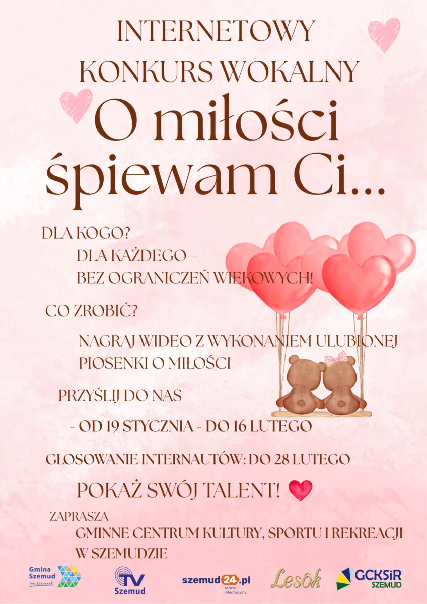 Gminne Centrum Kultury, Sportu i Rekreacji w Szemudzie ogłosiło nabór zgłoszeń do kolejnej edycji Internetowego Konkursu Wokalnego pt. „O miłości śpiewam Ci”. Wydarzenie ma charakter otwarty i skierowane jest do wszystkich grup wiekowych – od dzieci i młodzieży, po dorosłych oraz seniorów.