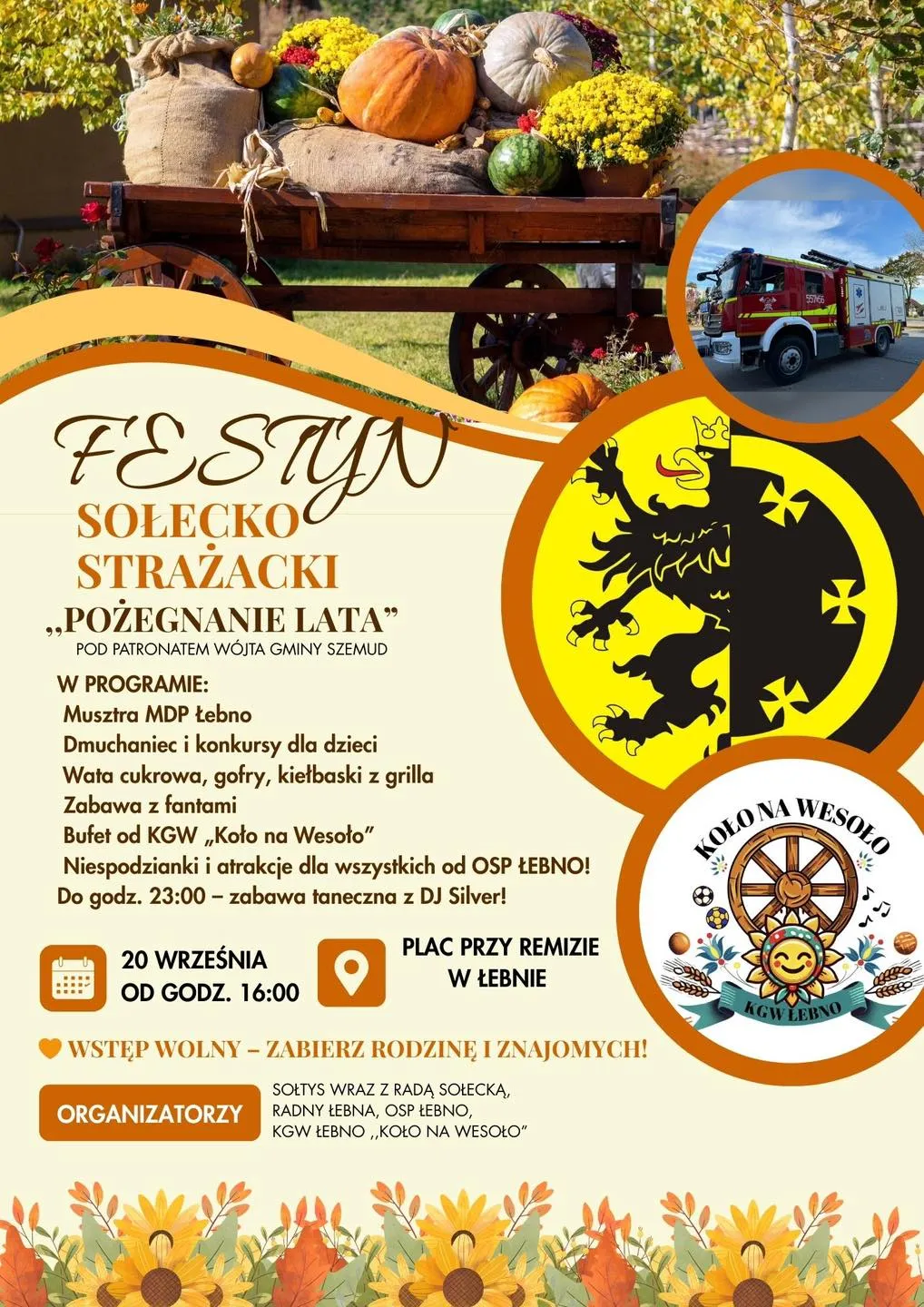 W sobotę, 20 września, na placu przy remizie w Łebnie odbędzie się „Pożegnanie Lata” – festyn sołecko-strażacki. Wydarzenie rozpocznie się o godzinie 16:00 i potrwa do późnych godzin wieczornych. Organizatorami wydarzenia są sołtys i rada Sołecka Łebna, radny Łebna, Ochotnicza Straż Pożarna w Łebnie oraz Koło Gospodyń Wiejskich „Koło na Wesoło”. Patronat nad wydarzeniem objął Wójt Gminy Szemud. Wstęp na festyn jest wolny.