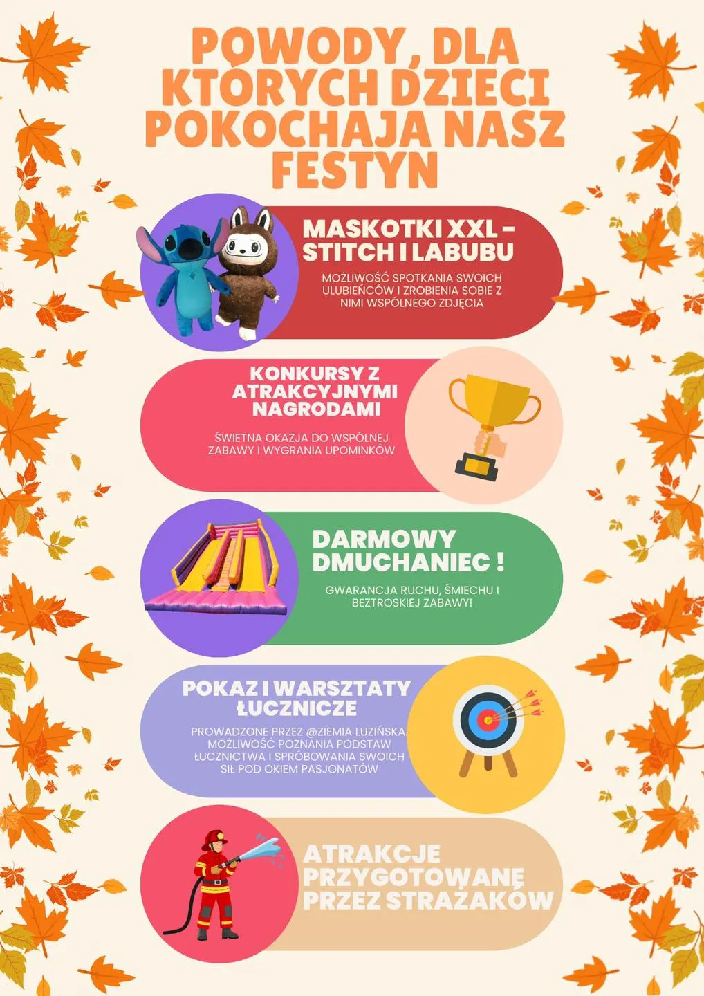 Organizatorzy przygotowali bogaty program atrakcji dla uczestników w każdym wieku. Najmłodsi będą mogli bawić się na dmuchańcach, wziąć udział w licznych konkursach oraz grach z nagrodami.
