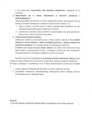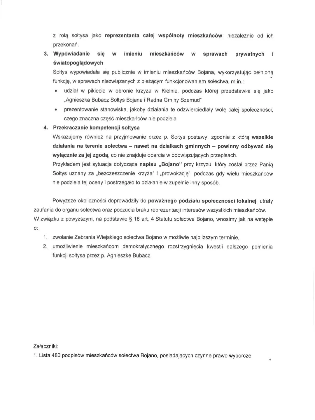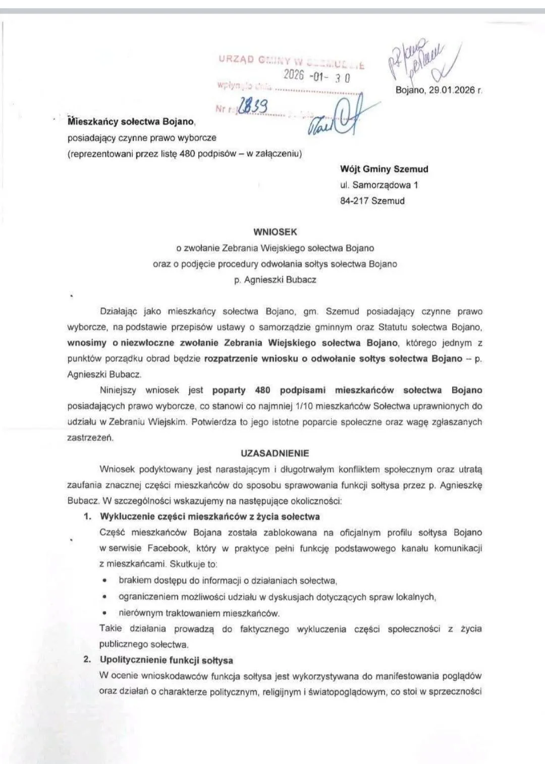 Pod koniec stycznia (29.01.2026 r.) grupa mieszkańców sołectwa Bojano złożyła na ręce Wójta Gminy Szemud oficjalny wniosek o zwołanie Zebrania Wiejskiego oraz podjęcie procedury odwołania sołtys, pani Agnieszki Bubacz. Pod pismem podpisało się 480 osób posiadających czynne prawo wyborcze.