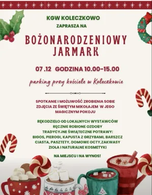 W Koleczkowie rozpocznie się od Bożonarodzeniowego Jarmarku KGW Koleczkowo, który potrwa od 10:00 do 15:00 na parkingu przy kościele. Będzie to idealna okazja do zakupu rękodzieła od lokalnych wystawców, tradycyjnych ozdób oraz spróbowania świątecznych potraw, takich jak bigos, pierogi, barszcz, kapusta z grzybami, czy domowe ciasta. Na Jarmarku będzie także Magiczny Pokój Świętego Mikołaja, gdzie dzieci będą mogły się z nim spotkać i zrobić pamiątkowe zdjęcie. Po Jarmarku, o godzinie 17:00, mieszkańcy spotkają się, aby wspólnie odpalić sołecką choinkę na pętli autobusowej przy Pomniku Partyzantów. Na gości czekać będzie Wizyta Mikołaja z upominkami, ciepłe kakao, pyszne ciasta oraz coś rozgrzewającego dla dorosłych.