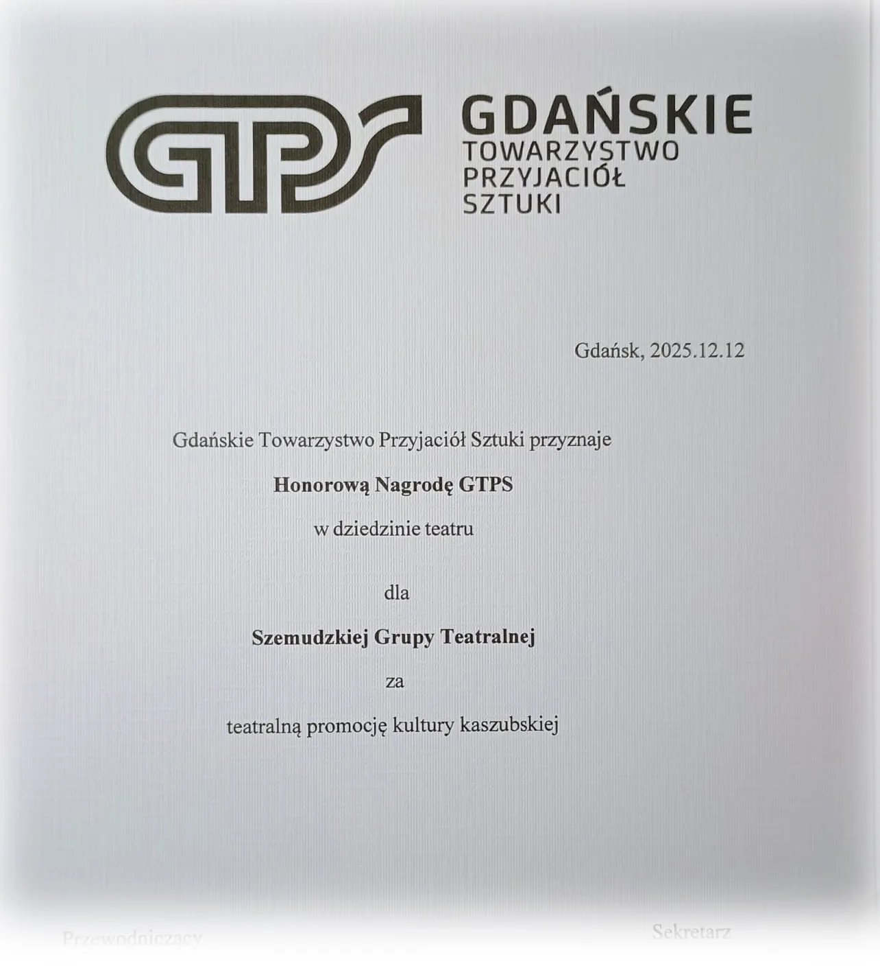 W piątek, 12 grudnia, Gdańskie Towarzystwo Przyjaciół Sztuki wręczyło Honorowe Nagrody GTPS 2025, doceniając wybitny wkład w rozwój i promocję kultury pomorskiej. Wśród tegorocznych laureatów znalazły się aż dwie organizacje związane z Gminą Szemud, co jest ogromnym wyróżnieniem dla lokalnego środowiska artystycznego. Uroczysta Gala wręczenia nagród odbyła się w Galerii PUNKT Gdańskiego Towarzystwa Przyjaciół Sztuki w Gdańsku.