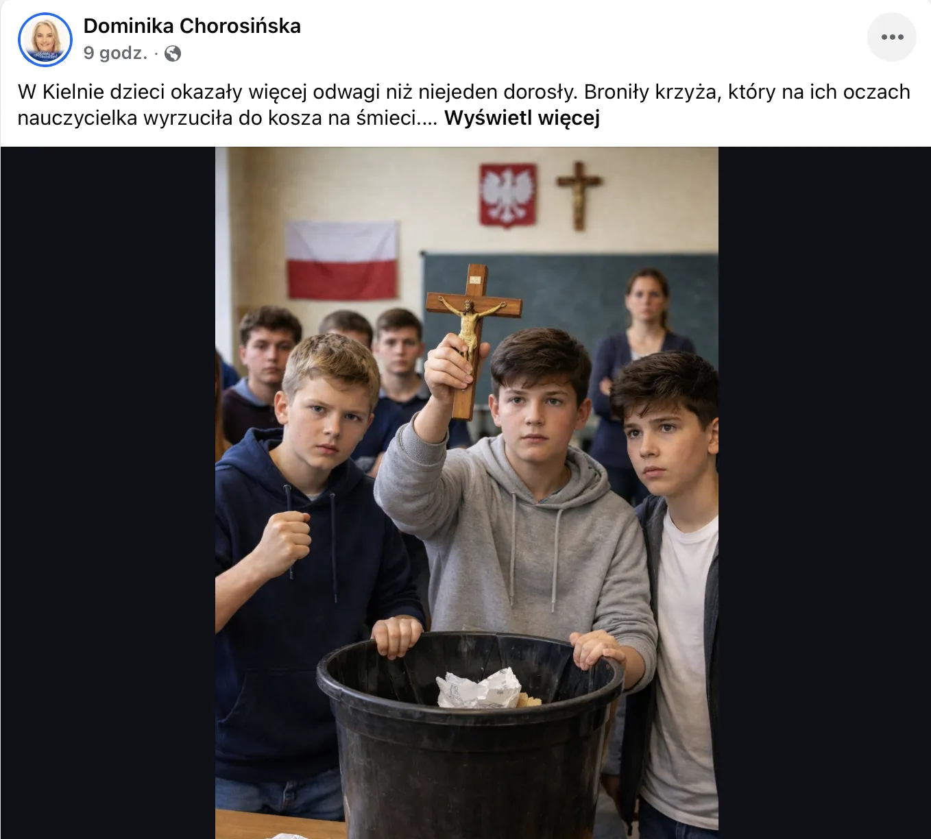 Oliwy do ognia dolały media społecznościowe. Osoby publiczne udostępniały obrazy przedstawiające dzieci wyciągające drewniany krzyż ze śmieci. Szybko okazało się, że zdjęcia te zostały wygenerowane przez sztuczną inteligencję. Autorzy tych postów często nie informowali odbiorców, że są to grafiki fikcyjne, co wprowadza wielu internautów w błąd i doprowadziło do ogromnej eskalacji napięć oraz fali hejtu wymierzonego w nauczycielkę.