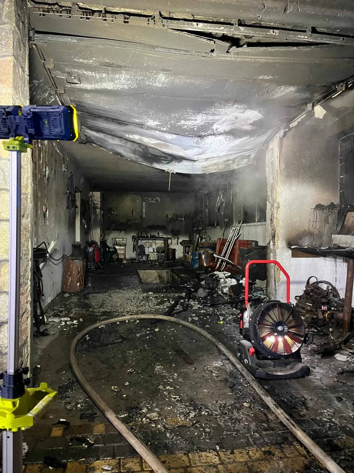 Ratownicy zabezpieczyli miejsce zdarzenia, odłączając zasilanie energii elektrycznej w garażu, następnie przystąpiono do gaszenia palącego się pojazdu oraz garażu. Przybycie zastępów Państwowej Straży Pożarnej (PSP) spowodowało zwiększenie sił ratowniczych w trakcie gaszenia samochodu oraz garażu. Pożary zlokalizowano i ugaszono, a następnie pogorzelisko przelano wodą. Obiekt został przewietrzony oraz sprawdzony miernikiem wielogazowym.