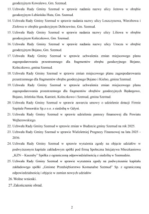 W wyniku głosowania radna Agnieszka Bubacz została odwołana z funkcji wiceprzewodniczącej Rady Gminy Szemud. W ramach wolnych wniosków złożono prośbę o przebudowę ulic Majkowskiego i Leona Heyke, znajdujących się w pobliżu szkoły w Bojanie. Prośbę argumentowano problemami komunikacyjnymi, które występują w godzinach szczytu.