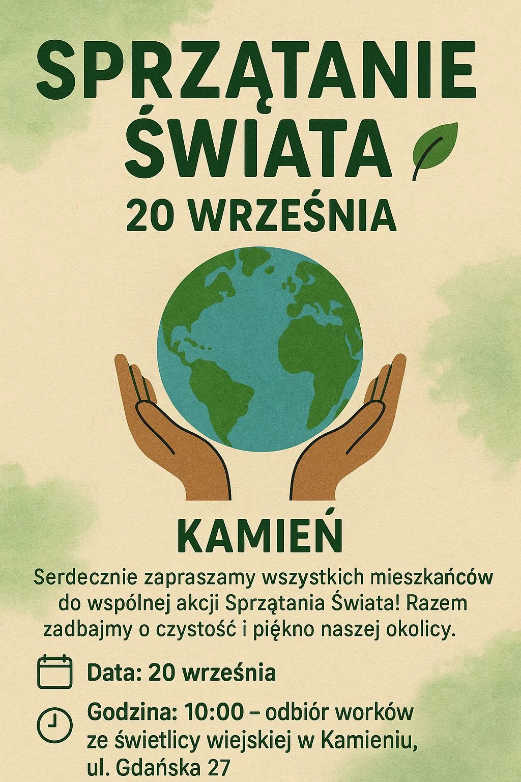 Kamień: Akcja "Sprzątanie Świata" w Kamieniu rozpocznie się o godzinie 10:00 odbiorem worków ze świetlicy wiejskiej. Mieszkańcy będą mogli sprzątać w kilku wyznaczonych punktach. Dodatkowo, dla uczniów biorących udział w akcji zostanie wystawione zaświadczenie o wolontariacie.