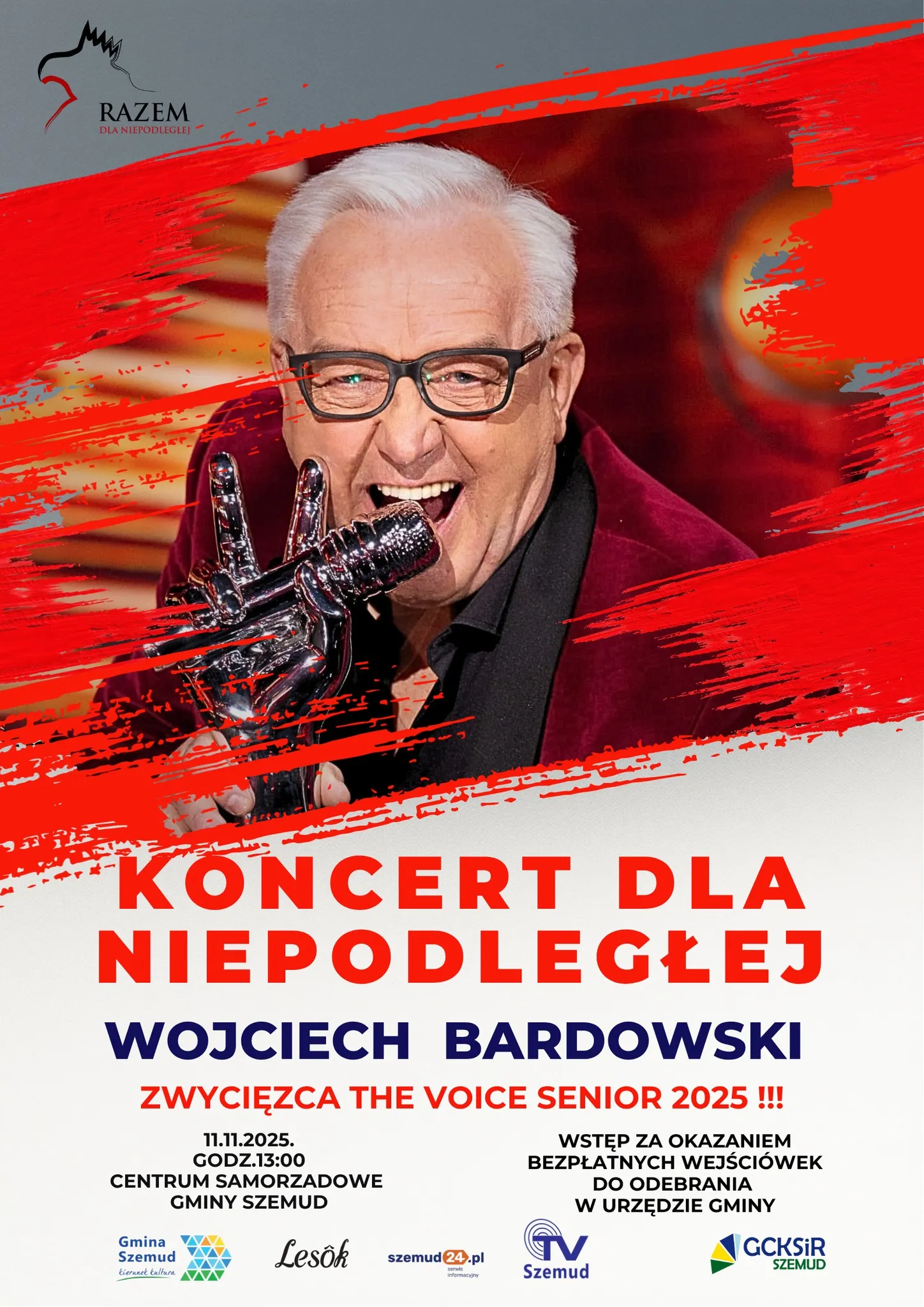 Punktem kulminacyjnym obchodów będzie Koncert Dla Niepodległej. Na scenie Centrum Samorządowego o godzinie 13:00 wystąpi Wojciech Bardowski, zwycięzca programu „The Voice Senior 2025”.