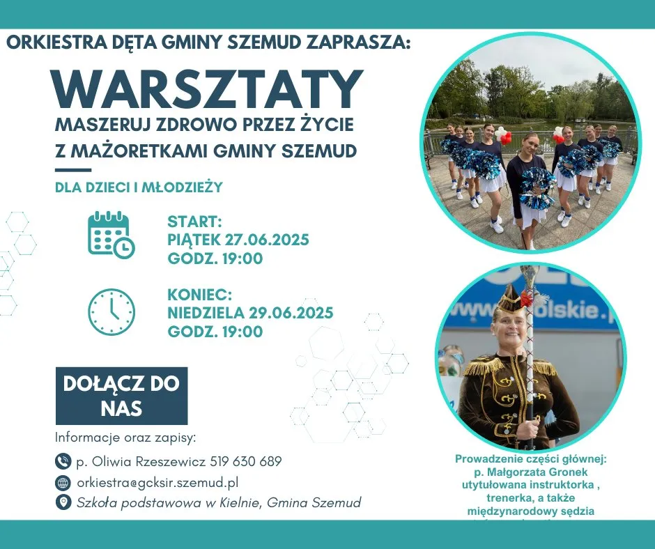 W dniach 27-29 czerwca Gminna Orkiestra Dęta Gminy Szemud zaprasza dzieci, młodzież i dorosłych na trzydniowe warsztaty z mażoretkami pod hasłem „Maszeruj Zdrowo przez Życie”. To wyjątkowe wydarzenie, pełne ruchu, rytmu i pozytywnej energii, odbędzie się na hali sportowej w Kielnie. Warsztaty realizowane przez Szemudzkie Stowarzyszenie Miłośników Sztuki, dofinansowane ze środków Gminy Szemud w ramach "Otwartego konkursu na realizację zadań publicznych w 2025 roku".