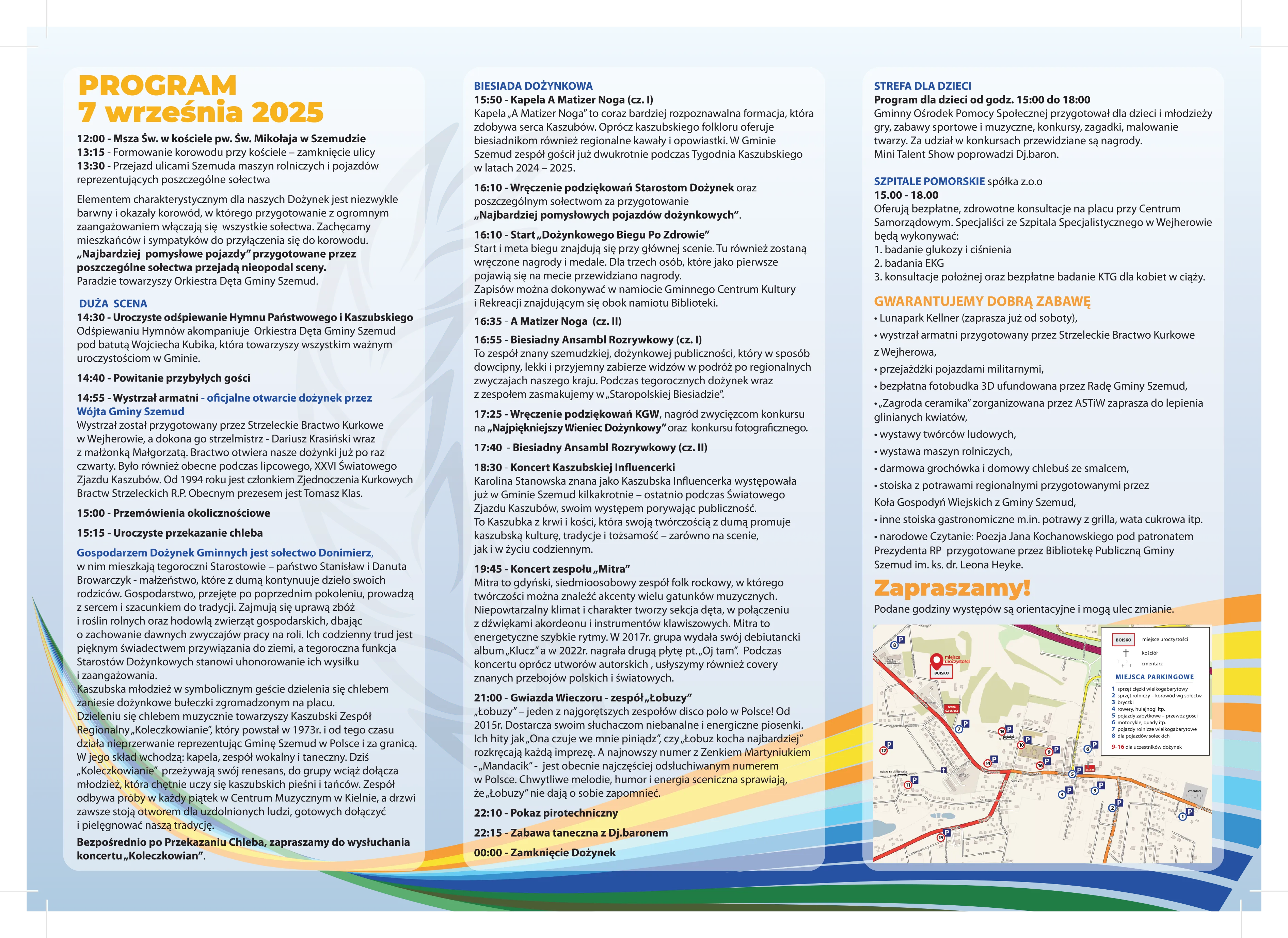 Poniżej szczegółowy plan Dożynek Gminnych, które odbędą sie na DUŻEJ SCENIE zlokalizowanej na boisku sportowym w Szemudzie: