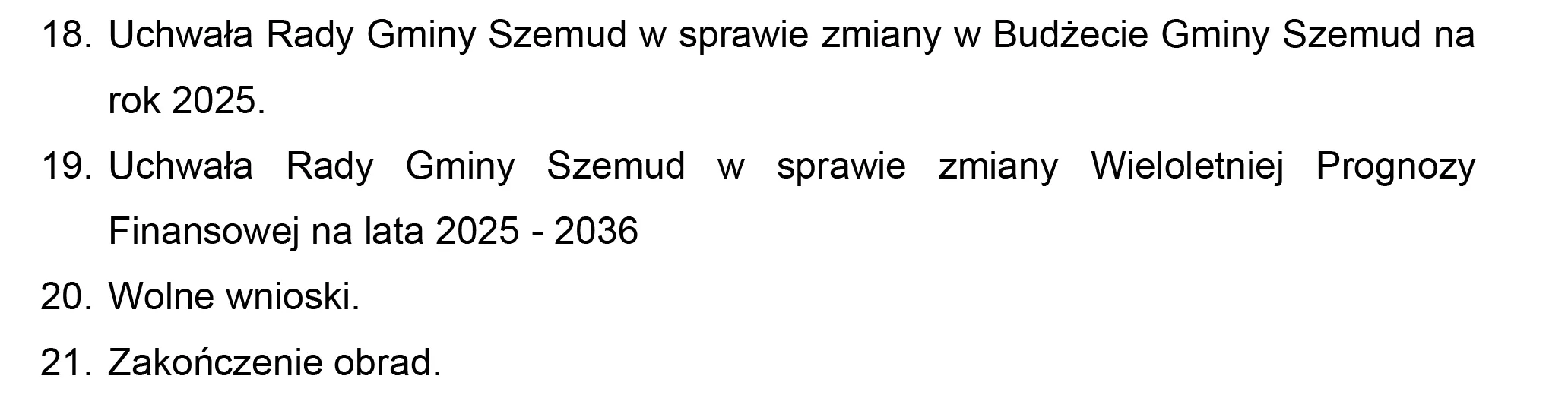 XXI Sesja Rady Gminy Szemud będzie miała charakter uroczysty. W programie obrad zaplanowano część oficjalną, którą uświetnią wystąpienia okolicznościowe zaproszonych gości oraz wręczenie nagrody w Konkursie Meldunkowym. W dalszej części sesji między innymi nastąpi głosowanie nad uchwałami Rady Gminy Szemud w sprawie: