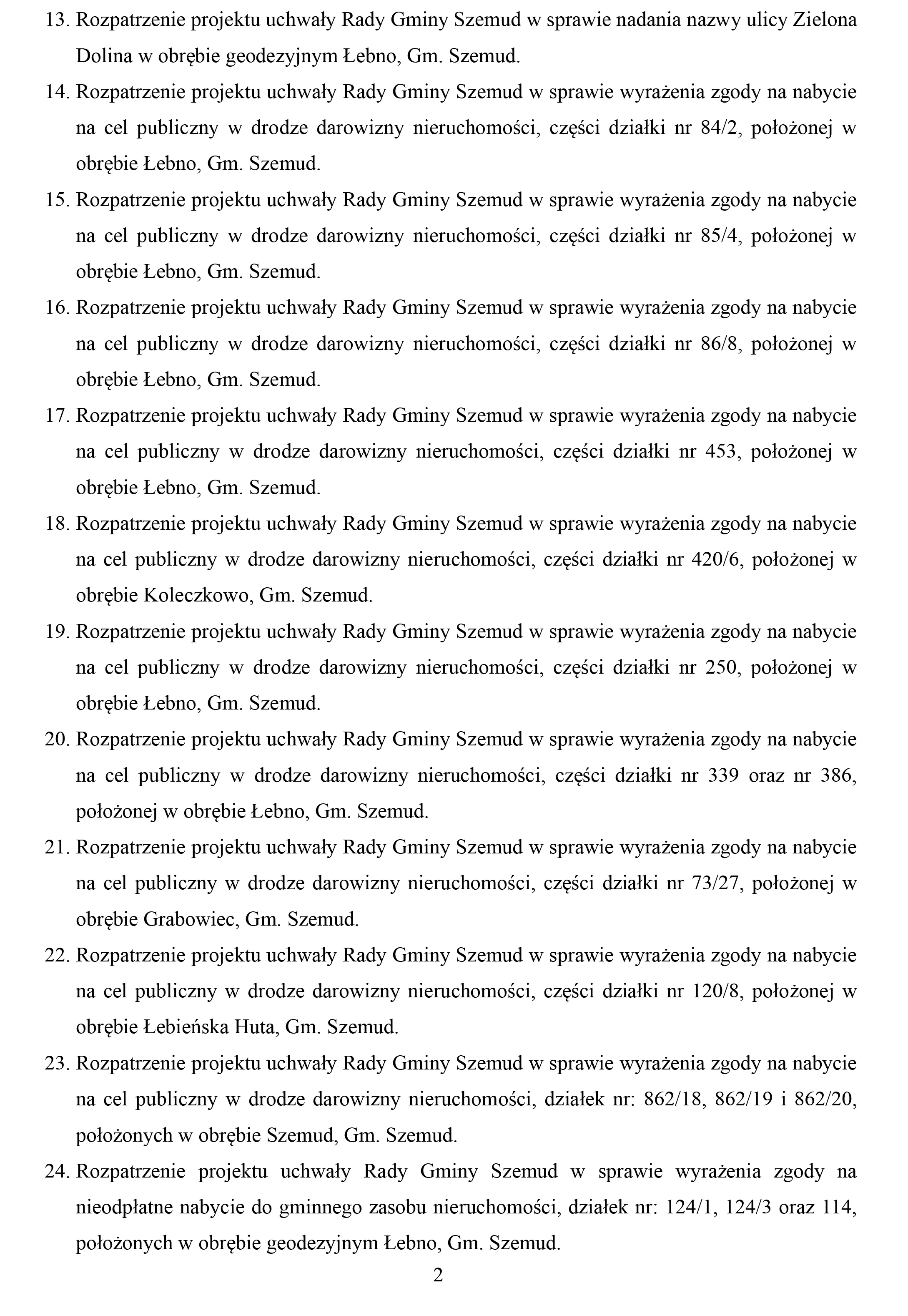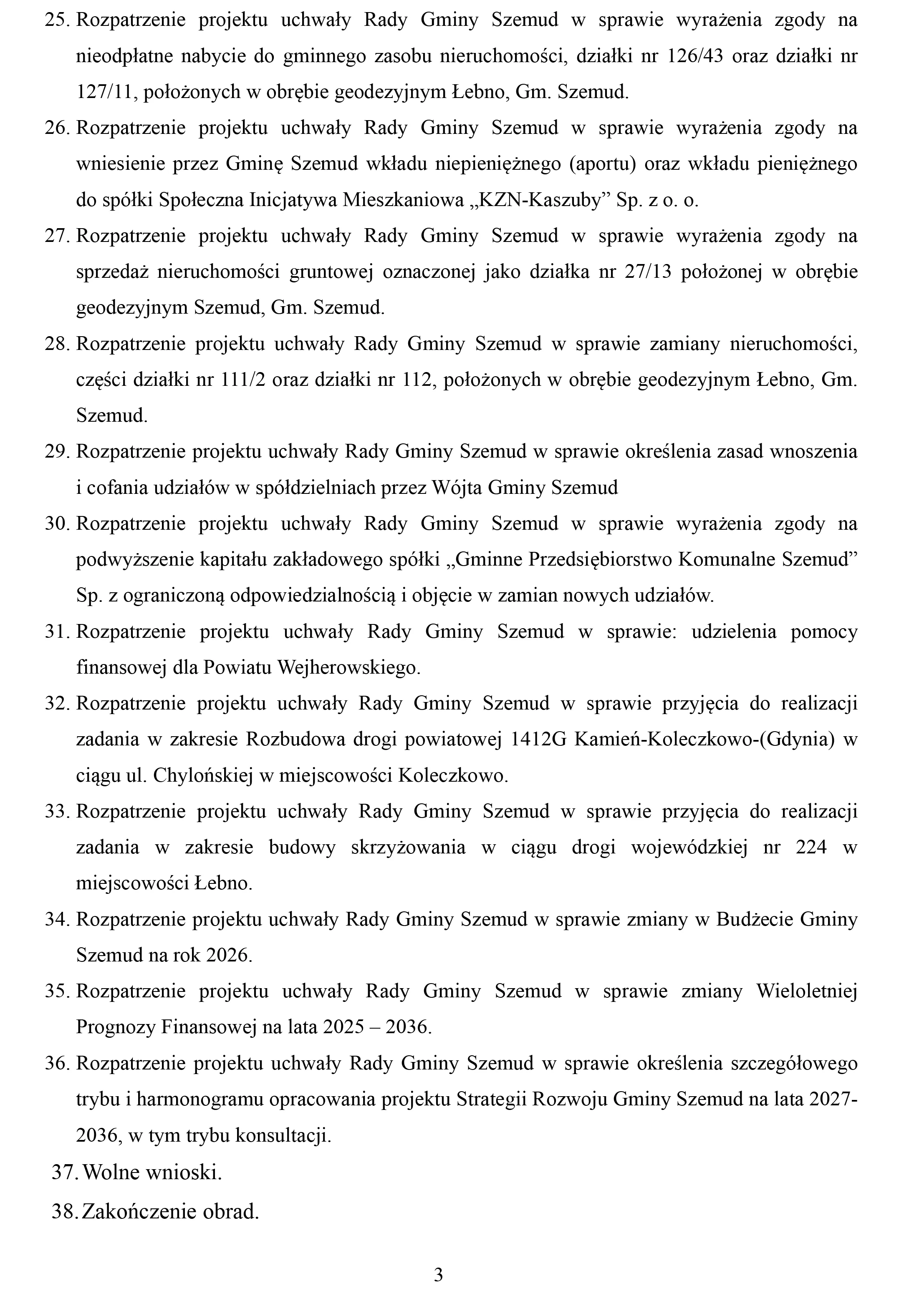 Podczas zaplanowanej XXII Sesji Rady Gminy Szemud radni zajmą się szerokim spektrum spraw, rozpoczynając od uroczystego wręczenia stypendiów oraz nagród w konkursie meldunkowym, by następnie przejść do kluczowych uchwał dotyczących polityki społecznej, w tym programów wspierania rodziny i opieki nad bezdomnymi zwierzętami. Część obrad zostanie poświęcona infrastrukturze i gospodarce przestrzennej, co obejmuje m.in. wyznaczenie nowych przystanków w Szemudzie oraz liczne decyzje o nabyciu nieruchomości na cele publiczne w drodze darowizny. Samorządowcy pochylą się także nad wzmocnieniem kapitałowym spółek komunalnych i inicjatyw mieszkaniowych, a zwieńczeniem sesji będą decyzje o zmianach w budżecie gminy oraz ustalenie harmonogramu prac nad nową Strategią Rozwoju Gminy Szemud na lata 2027–2036.
