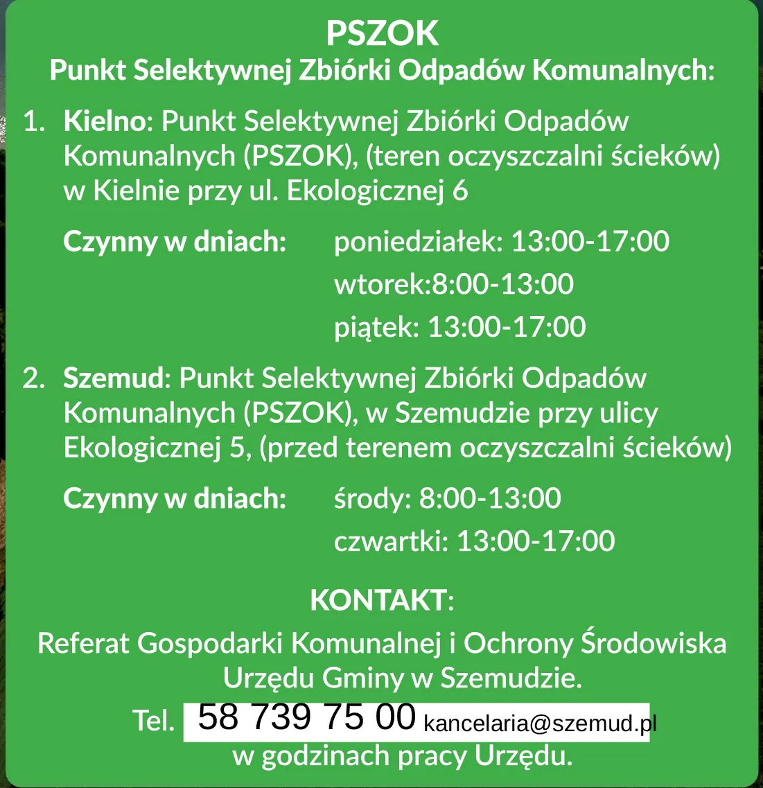 Punkty Selektywnej Zbiórki Odpadów Komunalnych (PSZOK) w Szemudzie oraz Kielnie będą nieczynne w dniach od 4 do 18 listopada 2024 r.