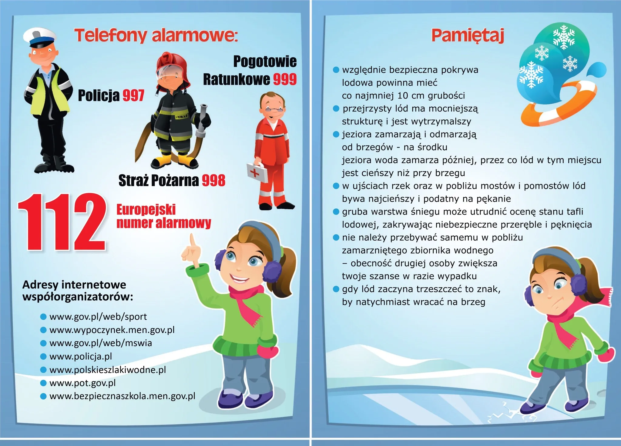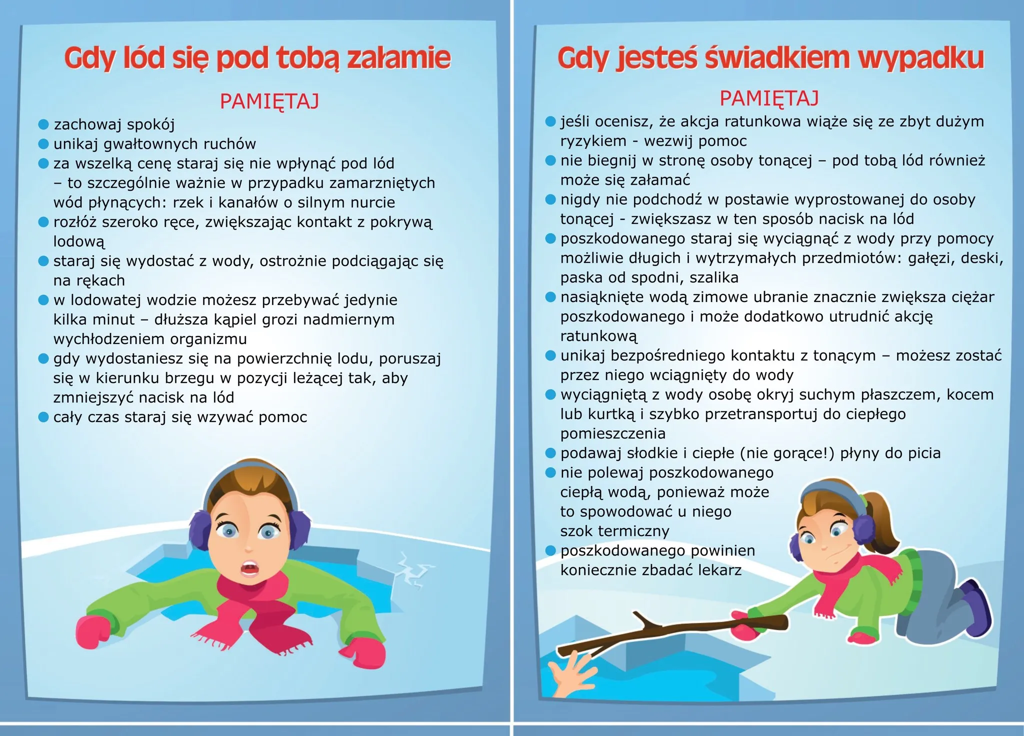 Poniżej materiały przygotowane przez Ministerstwo Sportu i Turystyki zawierające wskazówki, co zrobić w przypadku załamania się lodu lub bycia świadkiem wypadku.