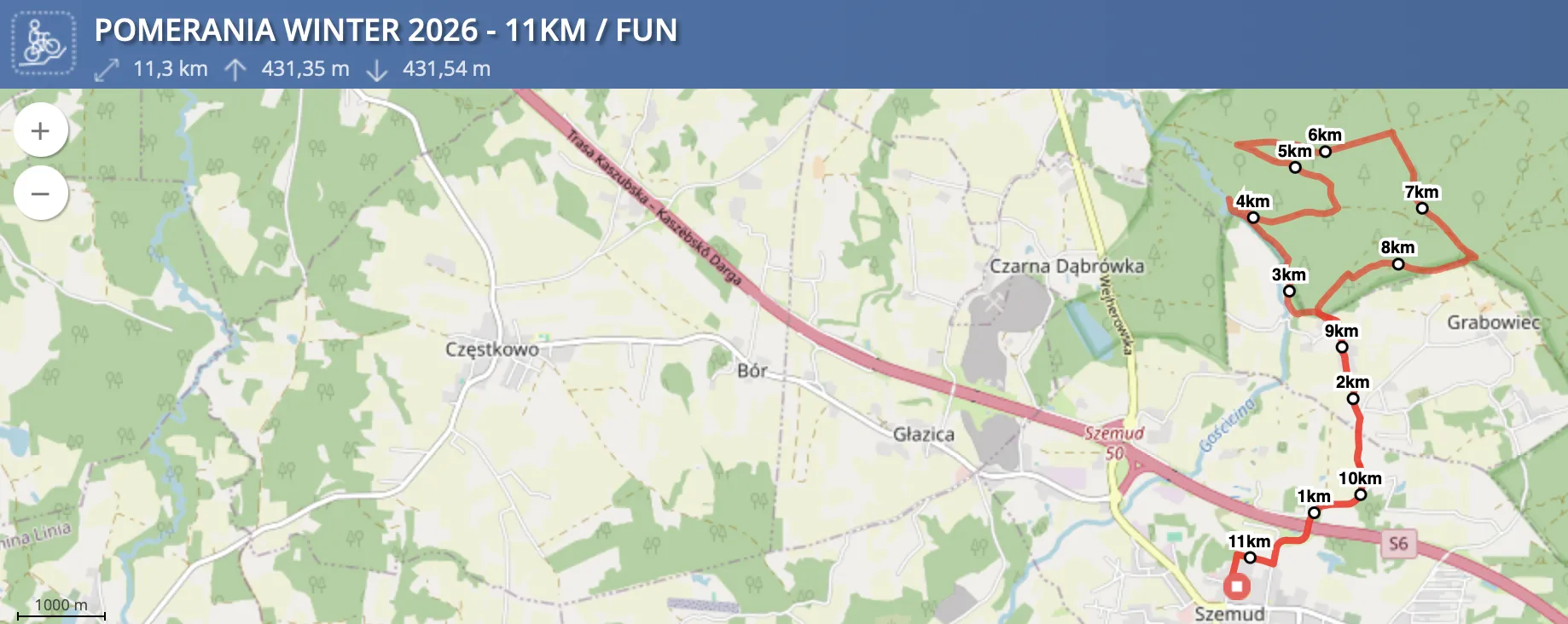 Start, meta oraz biuro – zlokalizowane będą w Gminnym Centrum Kultury, Sportu i Rekreacji w Szemudzie (ul. Szkolna 4A). Miasteczko zawodów znajdzie się wewnątrz hali sportowej, co zapewni uczestnikom komfortowe warunki: pełne zaplecze socjalne (szatnie, prysznice) oraz strefę cateringu.