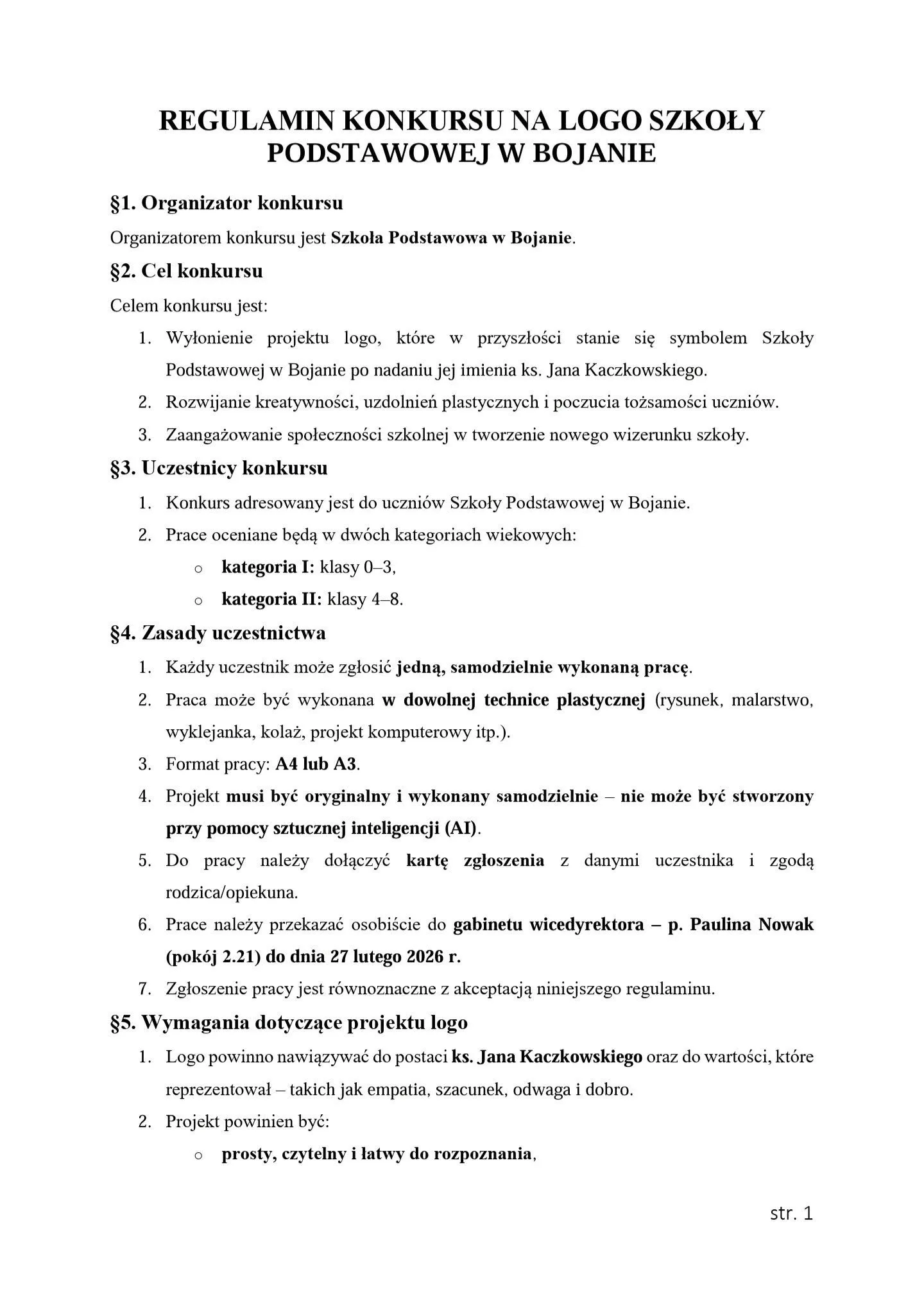 W związku z nadaniem imienia Szkole Podstawowej w Bojanie ks. Jana Kaczkowskiego, ogłoszono konkurs na projekt logo. To szansa dla uczniów, by ich kreatywność stała się oficjalną wizytówką szkoły na lata! Konkurs pod hasłem „Stwórz symbol, który połączy nas wszystkich!” skierowany jest do wszystkich uczniów klas 0–8.